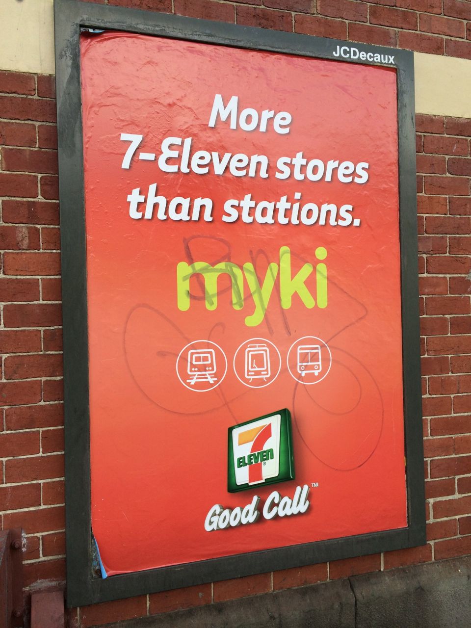 With this poster spread around Melbourne, 7-Eleven makes a pitch that should have been owned by newsagents. Years ago, while the myki public transport ticketing system was barely a thought, 7-Eleven trumped newsagents and negotiated unprecedented access to offer top-ups.