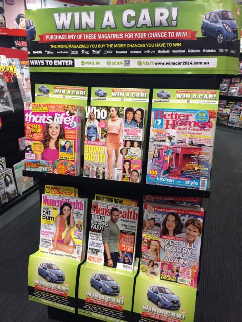 Here’s how we have adjusted our WIN A CAR aisle end promotion for the weekend. Subtle changes to make the most of more fresh titles. That’s Life and Who placed on the top and to the left for easy selection. BHG rounds out the top section here plus we have it in two other locations for the weekend. Note Women’s Health and Men’s Health together – very important. Strong and consistent branding with WIN A CAR collateral too helps drive shopper engagement.