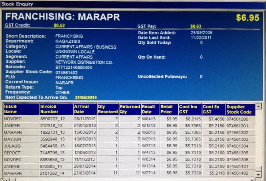I feel for the newsagent who had their supply of Franchising magazine bumped from one copy an issue to eleven copies of the latest issue – on the back of zero sales for each of the last eight issues. Click on the image to see for yourself.