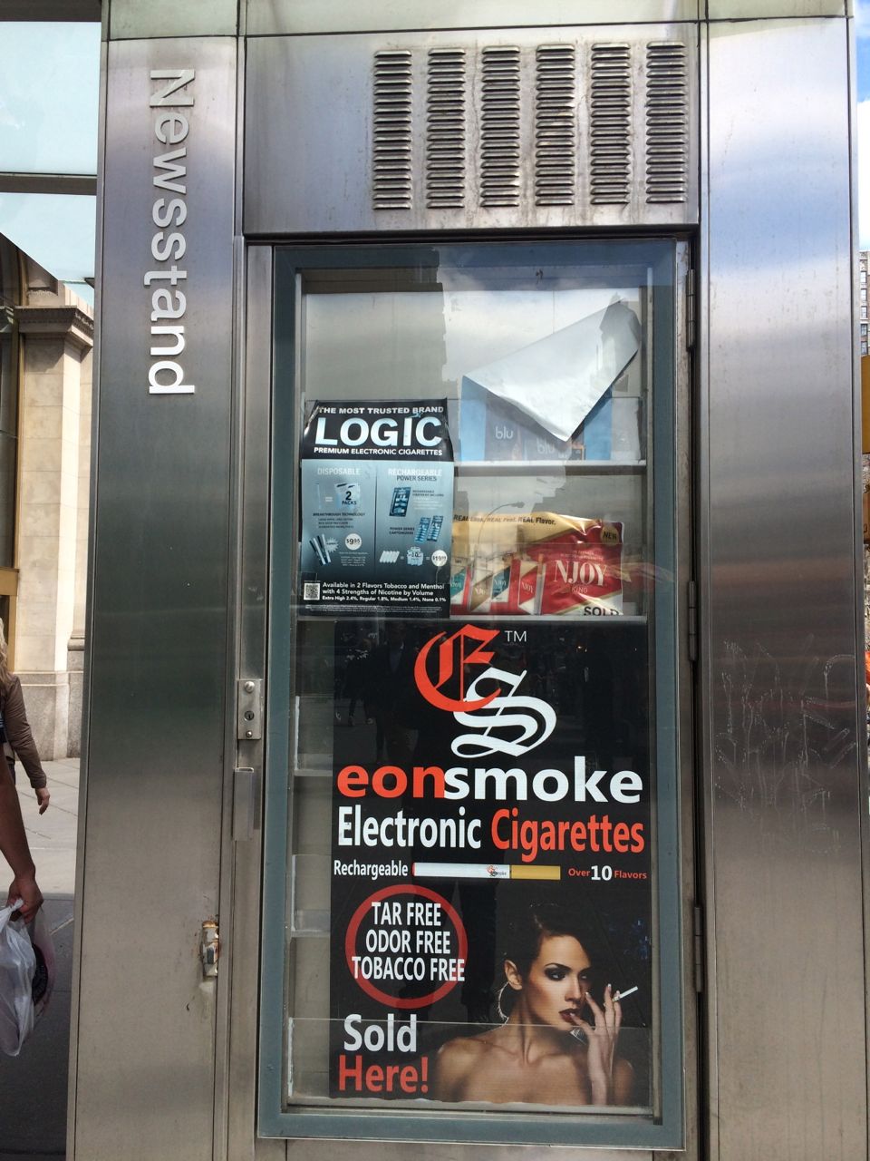 This photo shows the side of a news stand on Broadway in Midtown and where in the past regular cigarettes would have been advertised in the poster window you now have ads for two brands of electronic cigarettes.