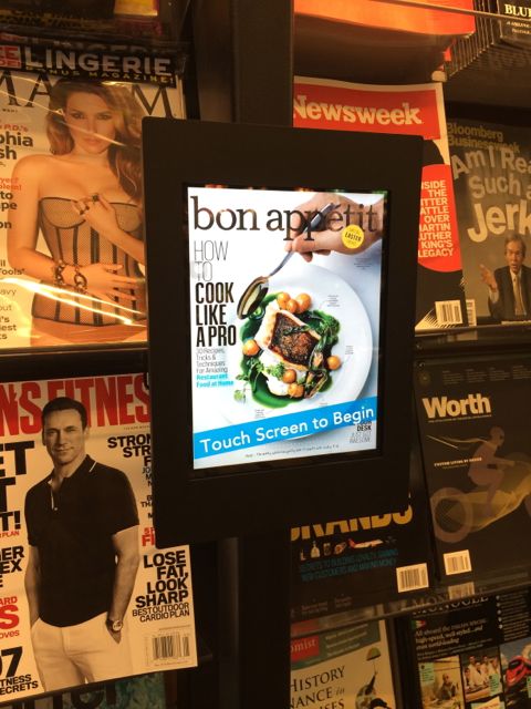On the retail tour in the US these last twelve days I have seen several versions of retailers selling magazine sin-store. This is the best and most tech connected – a tablet computer promoting subs in the magazine department and shoppers being encouraged to sign up on the spot. Now, this was in a transit location as were all I have seen. No high street magazine retailer was making a subscription pitch that I could see.