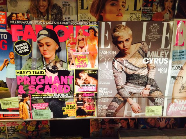 In the magazine section of a Hong Kong supermarket someone moved Famous with Miley Cyrus on the cover next to ELLE also with Miley Cyrus on the cover. I like this a lot. Sometimes, the cover subject for a magazine issue should guide its placement more than the masthead.