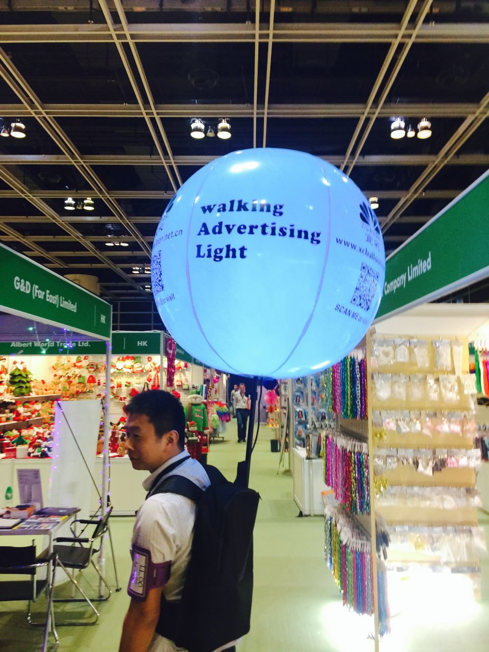 Check out the billboard I saw on the floor of the Hong Kong Gift Fair trade show this week. The balloon, backpack and related items cost US$100.00 – and you then have all you need for an attention grabbing billboard. I am not so sure about this. Sure, it would be noticed and talked about – but once the novelty wore off you’s have a balloon with a message in need of updating. That said, I’m writing about it so it was memorable and that’s vital for any ad message. It works best at night time.