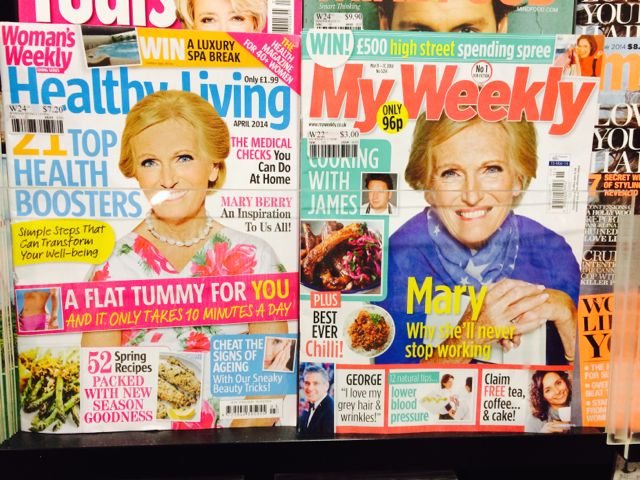 UK food TV star Mary Berry is on the cover of Woman’s Weekly Healthy Living, My Weekly and Cook Vegetarian right now – giving us an excellent opportunity to place all titles next to each other. You don’t need to know who she is – just recognise her face on the covers and encourage shoppers interested in Mary to purchase all three titles. A simple move could get you some extra sales.