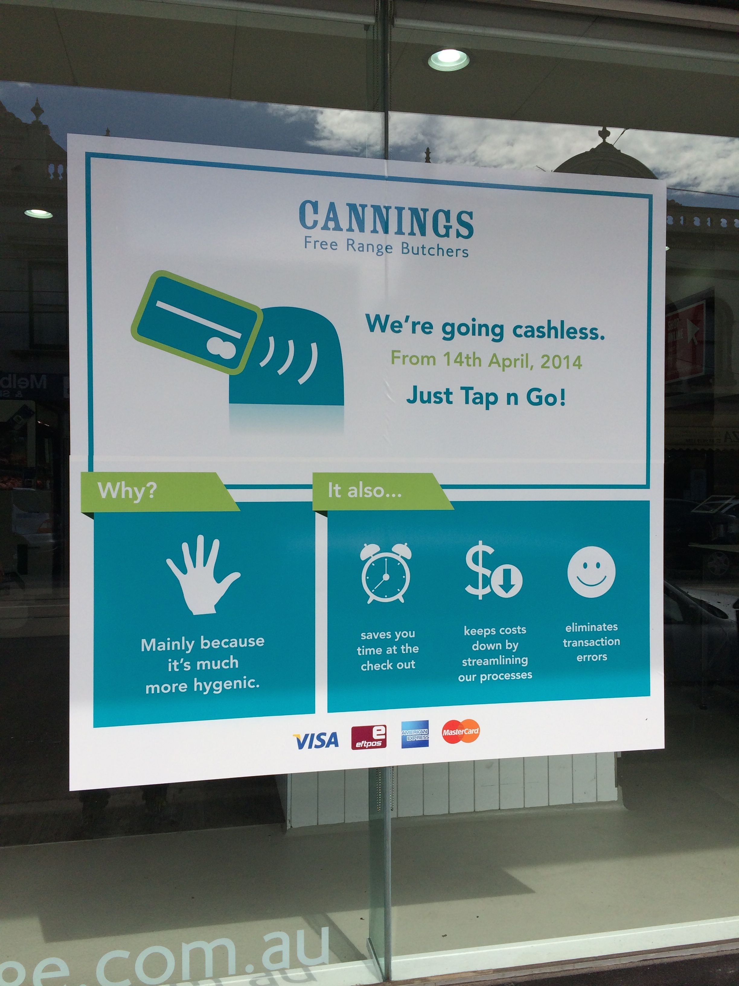 Cannings Free Range Butchers in Hawthorn Victoria have gone cashless. The sign on their window says they made the move to improve hygiene, save shoppers time, keep their costs down and eliminate errors.