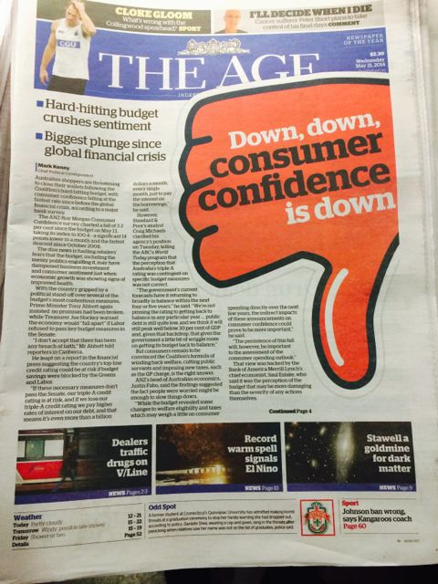 Shopper sentiment is, in part, driven by media coverage and today’s front page of The Age reports on and feeds into the survey results.