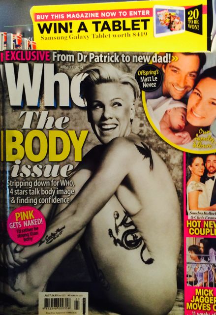 The nude photo of Pink on the cover of Who magazine is driving shopper interest in Australia and gaining media attention overseas. This is a magazine where the full cover needs to be displayed to get the full impact of the stunning artistic cover shot. Pink remains a hot performer in Australia – she’ll help us sell more copies of Who.