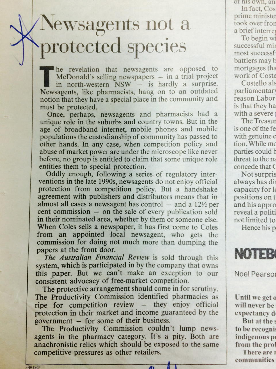I agreed with their thesis that we should be exposed to free market competitive pressures but noted that many anti-competitive pre deregulation supply practices disadvantaged newsagents. This anti-competitive behaviour by some suppliers continues today.