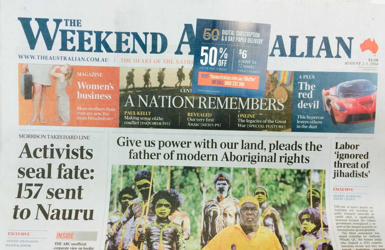 Covering up The Australian ·August 4, 2014 ·Mark Fletcher ·0 Comments It’s sad that at the time of celebrating 50 years, News Corp. is covering up the masthead of The Australian newspaper with a stuck on ad for home delivery subscriptions. Covering the masthead trashes the brand in my view. 1 likes newspaper masthead desecration Leave a Reply Cancel replyYour email address will not be published. Required fields are marked *Name * Email * Website Enter Code * Captcha Comment * Δ Post navigation Next ArticlePrevious Article
