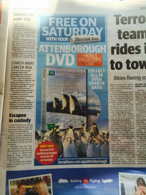 The same day the the cover price of the Herald Sun and other News Corp. newspapers increases the company is launching the David Attenborough DVD series in a marketing campaign that is expected to be successful in driving sales as people collect the coupon that is necessary for getting a DVD.