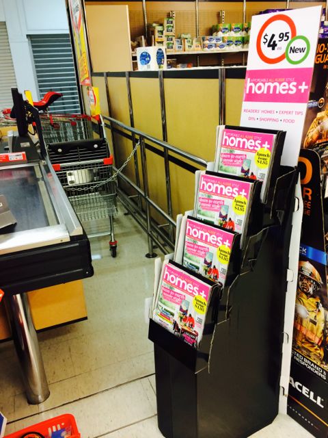 Bauer Media better not be paying Coles a premium to promote the launch issue of homes+ magazine. On the weekend I noticed this floor display unit placed at the checkout which is locked and used a clutter storage space in a busy inner city Coles location. It’s probably the worst location in this particular Coles supermarket.