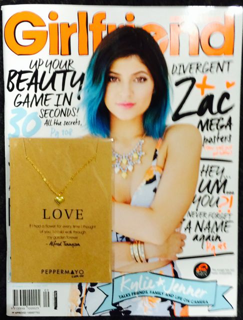 The pendant Peppermayo pendant with the latest issue of Girlfriend magazine is the ideal gift with purchase. It does not challenge space or make the pocket look untidy, it’s an ideal gift for those buying the title and it’s placed to enhance rather than detract from the cover. we have this issue in a couple of locations to leverage it.