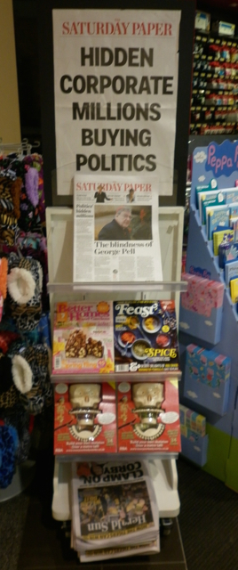 We are leveraging another provocative poster and front page for The Saturday Paper with this placement at the front of the newsagency today – facing into the mall.
