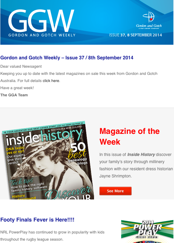I like the fresh approach from magazine distributor Gordon & Gotch in their contact with newsagents. The emails are helpful, easy to read and opening opportunities to new titles we can use to expand our magazine range.