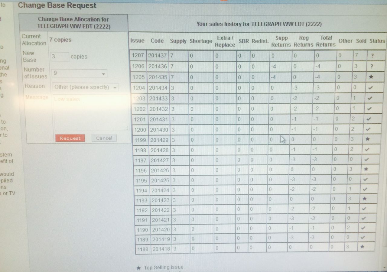 We often sold out of the 3 copies of the telegraph we received from network Services so they increased us to 7. I;d have thought 5 was okay but not 7. A review of our history shows volatility. It does not make sense for them to more than double supply. It makes me wonder if they are dumping excess stock they have to allocate. Better in our shop than their warehouse.