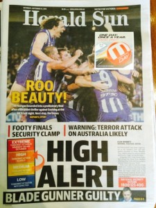 The Herald Sun yesterday took money from Mazda to obscure the photo of page one of the newspaper lauding the North Melbourne victory. !@*&ers is one North Melbourne fan said ripping the sticker off before buying it. I get that News wants the advertising bucks but getting between an AFL fan and their victory is dangerous, especially in Victoria.