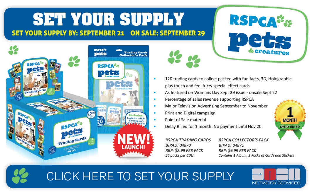 Kudos to Network Services and their publishing partner for giving newsagents the opportunity to set their own supply for the RSPCA trading cards. That Coles and Woolworths will not have this product and the free gift of a pack on Woman’s Day next week makes the opportunity compelling.