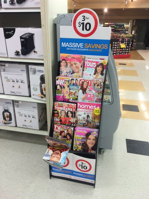 Here is how Coles is promoting the three Bauer magazines for $10 offer at a local Coles supermarket. I feel for the newsagent nearby. They can’t compete with this cheap deal. The Bauer pricing approach makes competition tougher.