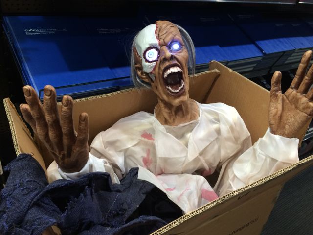 Halloween is always a fun season on the shop floor and setting up. Yesterday it was a thrill to peek inside some of the boxes and the horrors we ordered. This character in the photo is one of several larger-format Halloween products we have. They make for good display features and centrepieces for customers hosting a Halloween party.