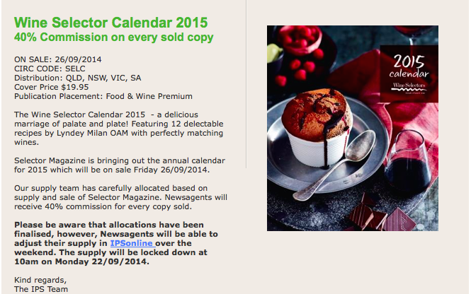 I don’t want calendars off of which I make less than 50%. This is why I am making sure I don’t get the calendars IPS has allocated to newsagents. IPS emailed newsagents with only the weekend to opt out of a bad deal.