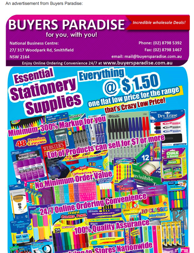 The ANF will say it was an advertisement. Indeed, the subject line makes it clear: ADVERTISEMENT: New profit source for essential stationery supplies – everything @1.50 plus bargain deals on gift supplies, party supplies, batteries. However, all actions by the ANF need to be considered through their charter to serve the interests of newsagents.