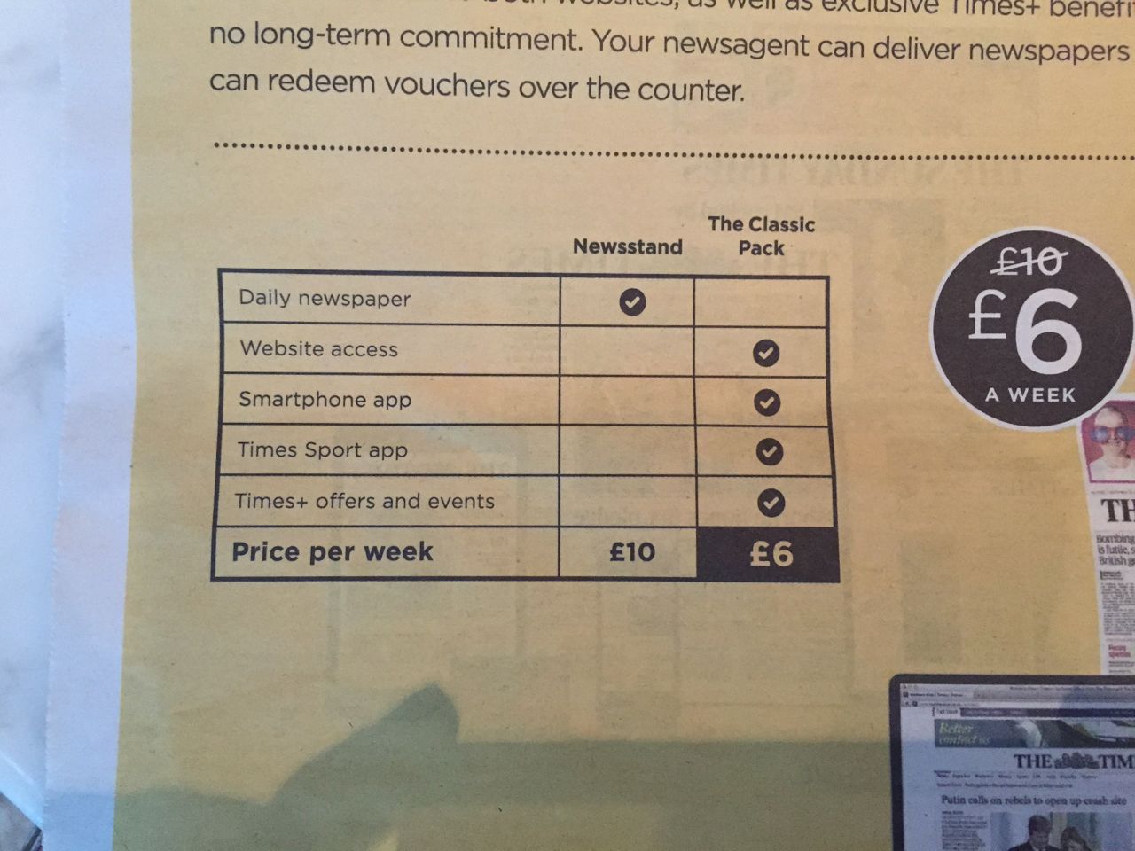 The Times here in the UK today has a double page ad promoting online over digital. The comparison table makes the case for the value in a £6 for the digital package versus a £10 spend for the print product. The irony is the use of the print product to push people from it.
