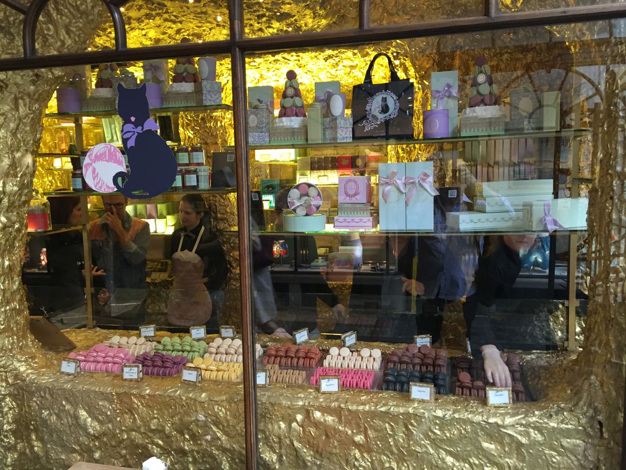 Macarons are everywhere these days. These once hard to find tasty treats are being sold in many different businesses. This is why I liked the retailer I saw in London yesterday – they created a retail space that made the product the hero, that made their macarons have a sense of difference over the macarons you could find elsewhere. The gold cave fit out sets high expectations.