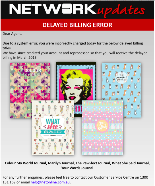 Network Services late this afternoon issues an email to newsagents advising that the journals distributed today from Universal magazines are , indeed, delay billed. While this is welcome news I suspect some newsagents will have processed returns already – because of lack of advice from Network and because they don’t need journals at sub-par margin.
