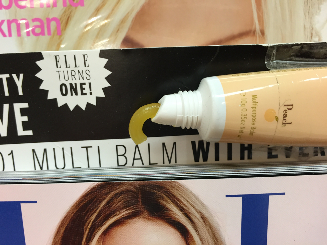 I let a staffer at Coles know that the cap was off the balm on the cover of a copy of Elle. These gifts are terrific but when a cover comes or a tube is punctured the damage to stock can be time consuming to address and costly to the business and publisher.