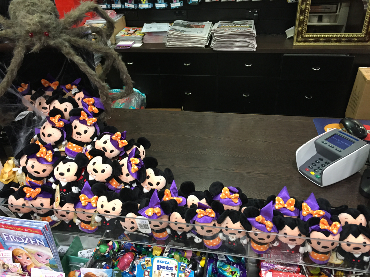 A team member created this display of Halloween-themed Mickey and Minnie Hallmark Itty Bittys at the counter.
