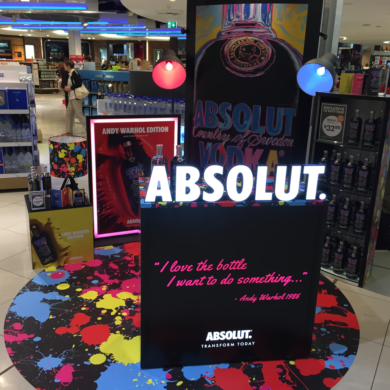 This Andy Warhol themed Absolute display is a good example. The detail in connecting the floor mat and the lamp cover, for example, is excellent. The layering of the elements on the display gives it a depth which works very well. The brand is the hero – as should be the case with any retail VM display.