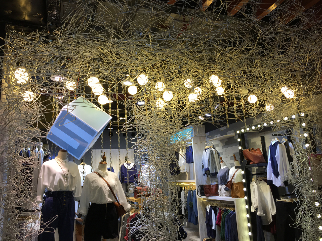 Check out the shop front created from old coat hangers that I saw in Guangzhou, China earlier this week. In a mall with more than 1,000 retail outlet, gaining shopper attention is challenging. This stands out for their different shop front and clever use of hangers.