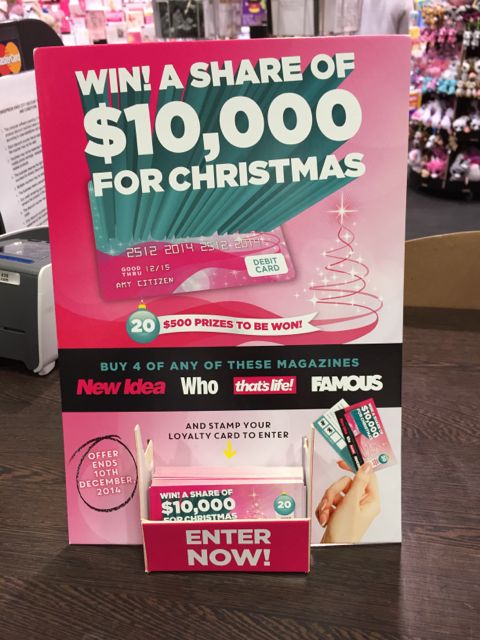 The WIN! A SHARE OF $10,000 FOR CHRISTMAS competition from Pacific Magazines is one such promotion through which newsagents can promote a valuable point of difference over other magazine retailers. We are promoting it at the counter, with the magazines supported by the promotion and on the lease line – facing into the mall.