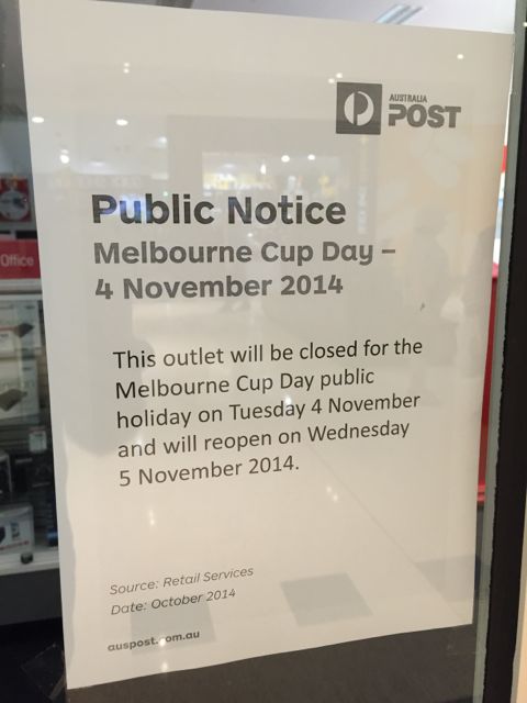 While other retailers in shopping malls are required to open Public Holidays, Australia Post corporate stores are not. Today, Melbourne Cup Day, Australia Post avoids the crazy penalty rates while retailers competing with them are hit by the cost. This situation is a benefit available to Australia Post solely because of their protected status as a government owned business. It is a perfect example of government ownership and protection providing them an unfair competitive advantage.