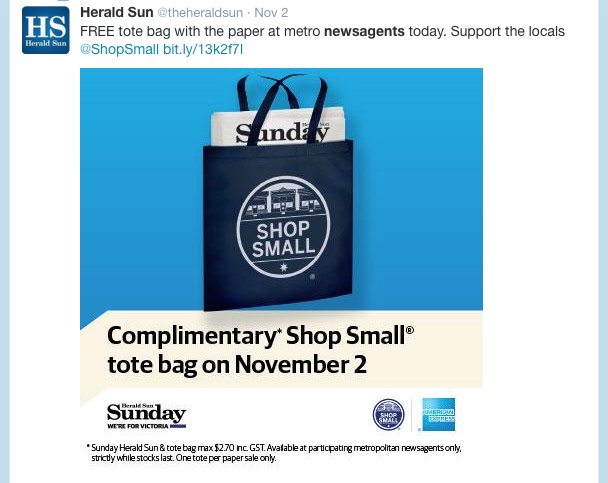 I was pleased but concerned to see News Corp. promoting newsagents with its tweet this Sunday gone promoting the free tote bag in support of Shop Small, the American Express promotion: FREE tote bag with the paper at metro newsagents today. Support the locals.