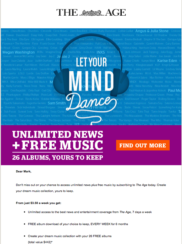 I received this offer by email from Fairfax yesterday for The Age: $3.50 a week for digital access for six months. The bulk of the email was about the music offer: a free album to download every week of the six months. The value proposition is pitched in therms of music and not news. I found the offer to be interesting and disappointing – that they have to do this to get people to ‘pay’ for news.
