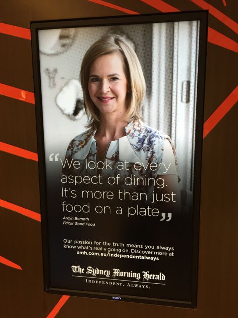 I like the ad campaign from Fairfax promoting their newspapers and featuring some of their best journalists and writers. This photo shows a digital ad at a Sydney airport newsagency. I have also seen the cinema, billboard and their TV ads in this series.