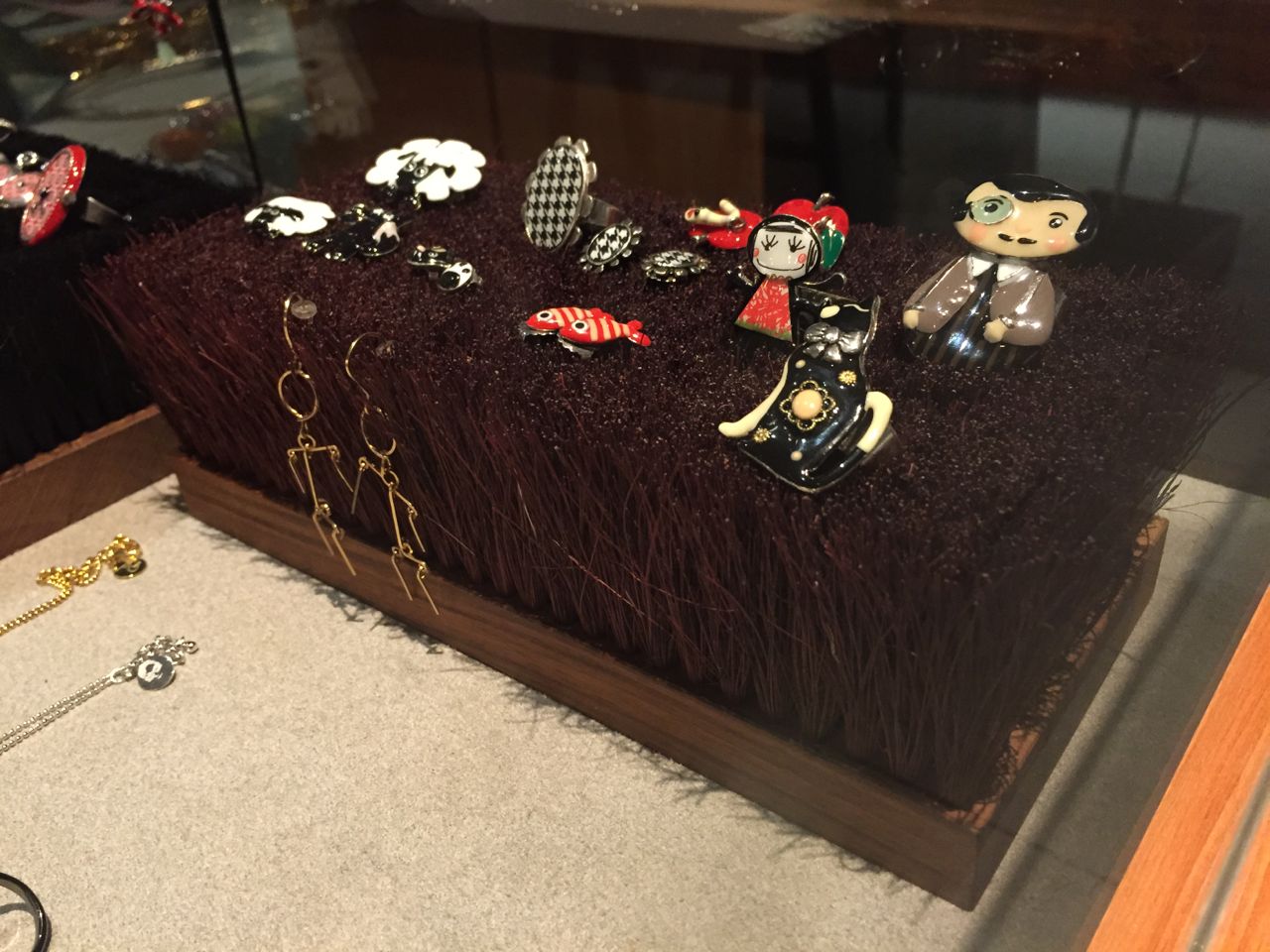 In a book / gift shop earlier this week I was impressed with how they display a small selection of jewellery. They have an upturned hard-bristled broom head onto which they place jewellery products. Such a simple idea yet so effective. We can easily copy this.