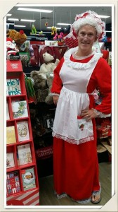 This photo shows the result of the post. Allan was dressed as Mrs Claus for the day and from all accounts customers loved it. It certainly made for a different experience in the shop yesterday – probably a welcome break to what is usual at this busy Christmas time of the year.