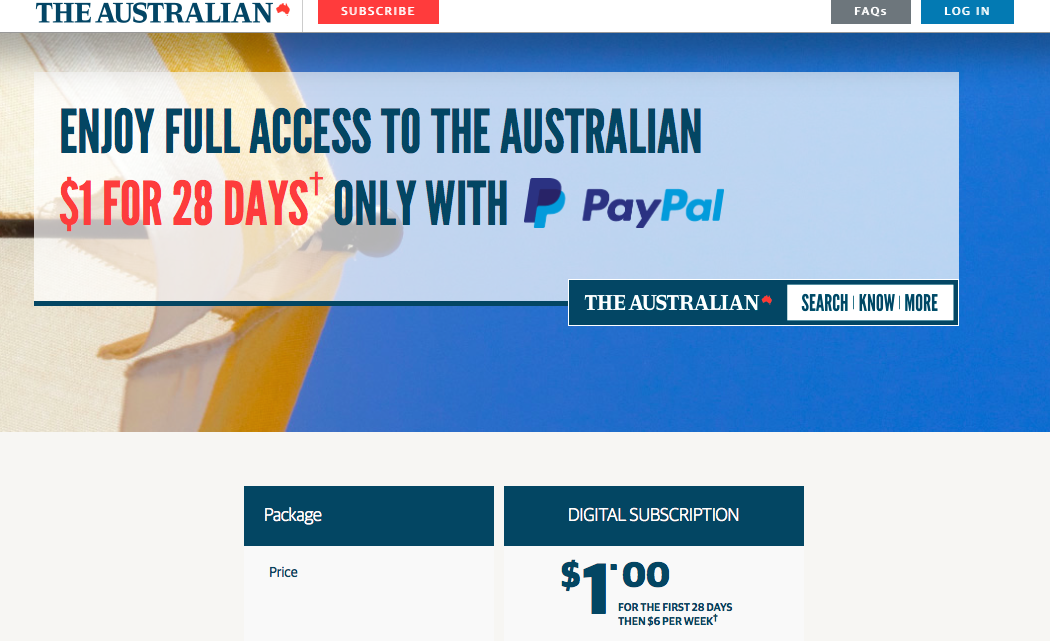 News Corp. is promoting a 28 day digital subscription to The Australian through PayPal in an email campaign that hit this morning. At the end of $28 days the subscription flips to $6 a week – a big jump.