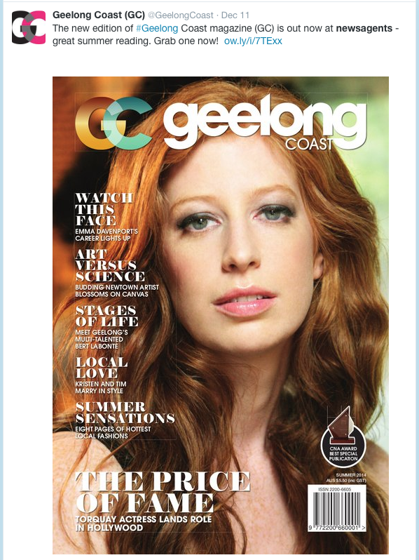 It’s good to see Geelong Coast magazine using Twitter to promote its latest issue as being available at newsagencies. I like this because they are only promoting our channel and because this is a special interest title. Special interest titles are vitally important to us, especially titles like Geelong Coast targeting a specific geographic area.