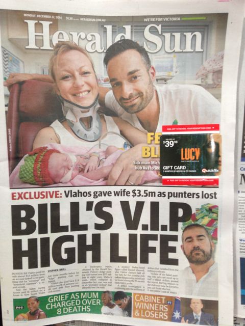 What’s the point of the story on page one of the Herald Sun? Looking at the cover it’s hard to tell since News Corp. covered the report with an ad for streaming service Quickflix. This from the same company that complains about how their product is displayed in newsagencies. Nuts.