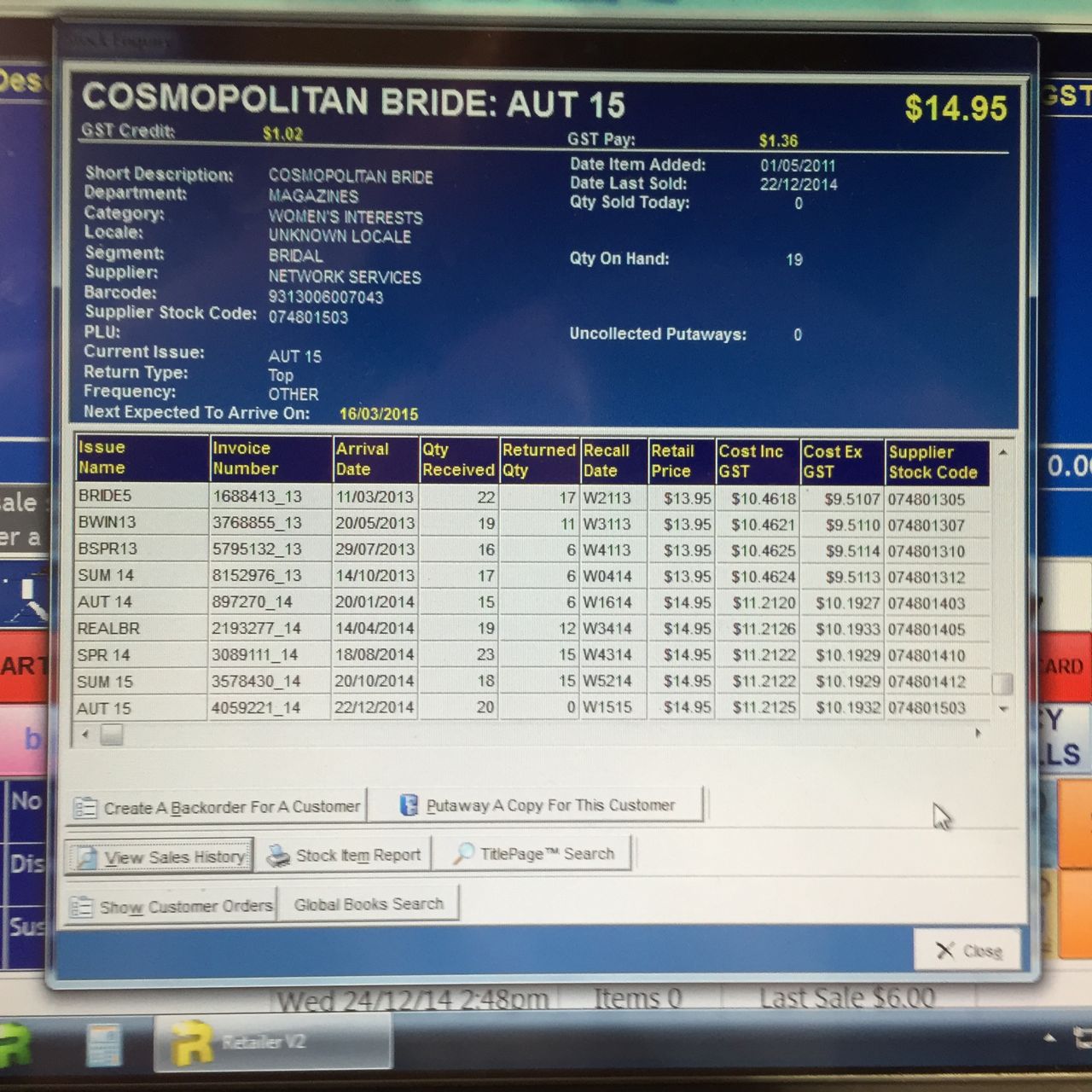 Why have they increased my supply? For no reason other than to shift stock out of the warehouse and into newsagencies. Our sales data does not warrant an increase. Indeed, the data warrants a decrease in supply of 50%.
