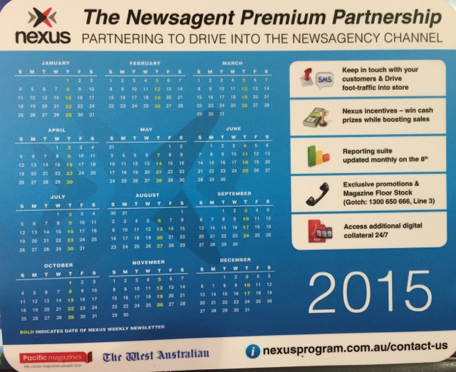 I like the mouse mat from Pacific Magazines promoting their Nexus marketing platform. It’s useful as a mouse mat and useful for engagement with Nexus. I’m an avid user of the platform for tracking my performance compared to others and for promoting to my customers.