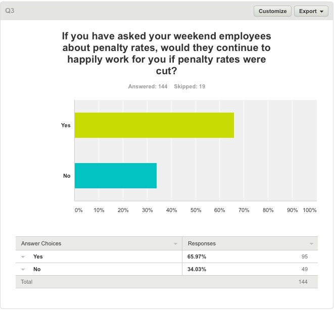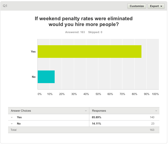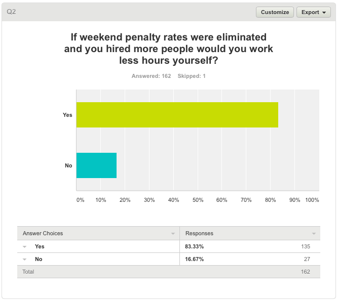 While this is an unscientific survey, it presents results that ought to encourage politicians to seek thorough research into the economic benefits and costs of the elimination of weekend penalty rates. While I am no economist, my sense is that such a move would be positive for the economy.