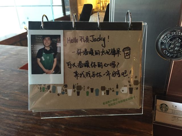 The photo shows the sign at the counter of a Starbucks I visited on the weekend. It has a photo of the barista, their name and tells me a bit about them, making the experience feel more personal than one might expect from a worldwide chain like Starbucks.