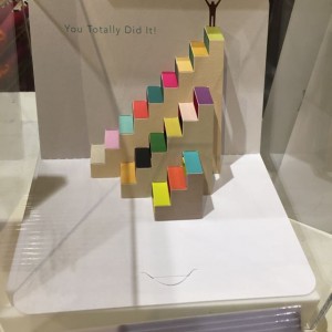 This greeting card offering congratulation to the recipient on reaching an achievement is one of the best cards I have ever seen. When you open it you see three flights of stairs with a character (you) at the top of the largest flight.