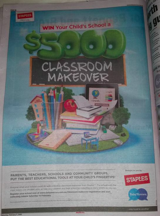 The marketing and promotions department from the APN owned The Daily Mercury newspaper in Mackay has launched a promotion offering a $5,000 classroom makeover as the prize. Readers collect tokens for their school over the duration of the promotion (Feb. 14 – Mar. 16) and the school with the most tokens at the end wins.