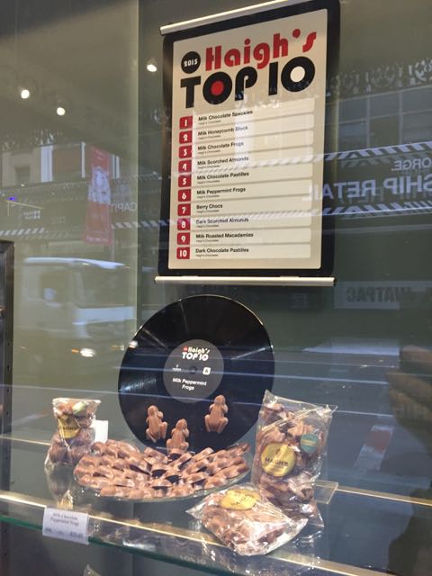 The window of the Haigh’s store on George Street in Sydney is based around a Top 10 music theme but the Top ten are their top ten products. The execution is excellent – quite eye catching.