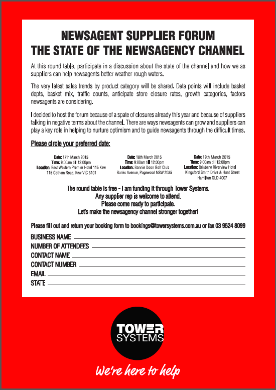 If you are concerned about the future of the newsagency channel, come along and participate. Access to the round table is free – I am funding it through my newsagency software company Tower Systems. Any supplier is welcome.